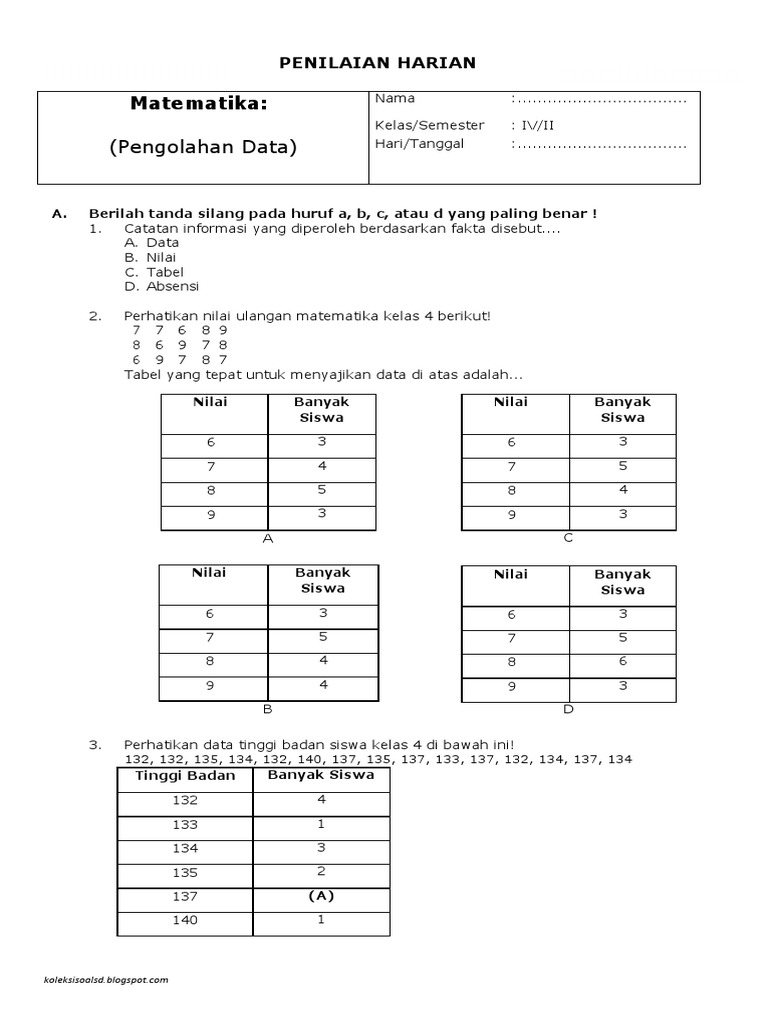 Soal Matematika Pengolahan Data Kelas 4. 15.berikut ini adalah data nilai siswa kelas 4 sdn pati lor 4 saat ulangan matematika. Soal matematika pengolahan data kelas 4 sd.